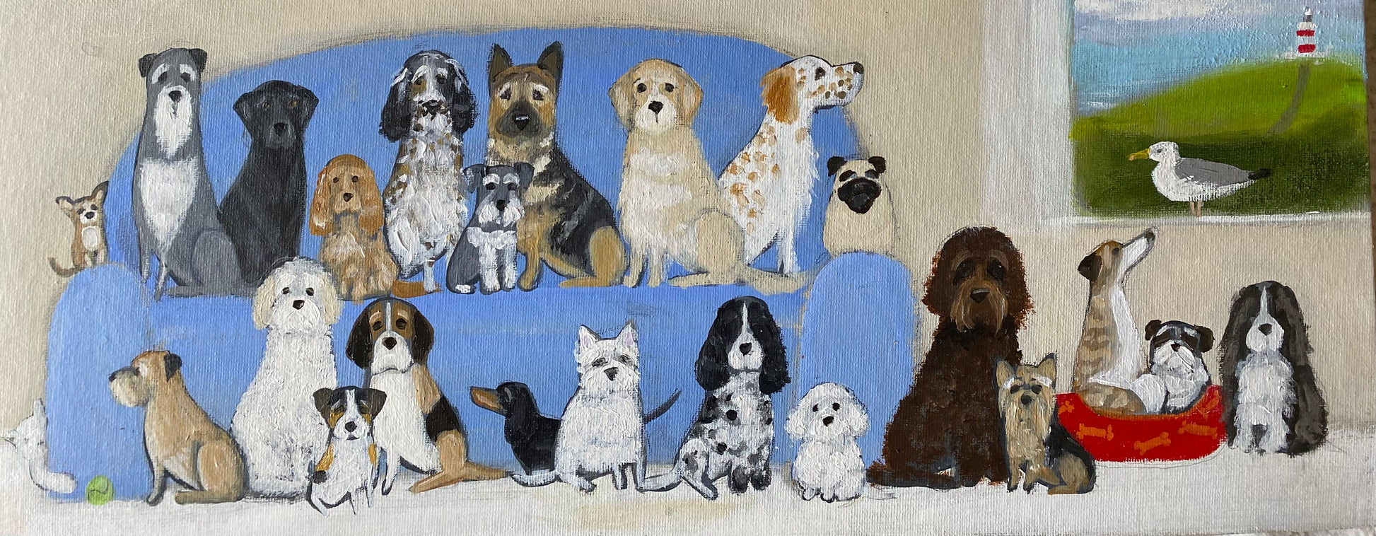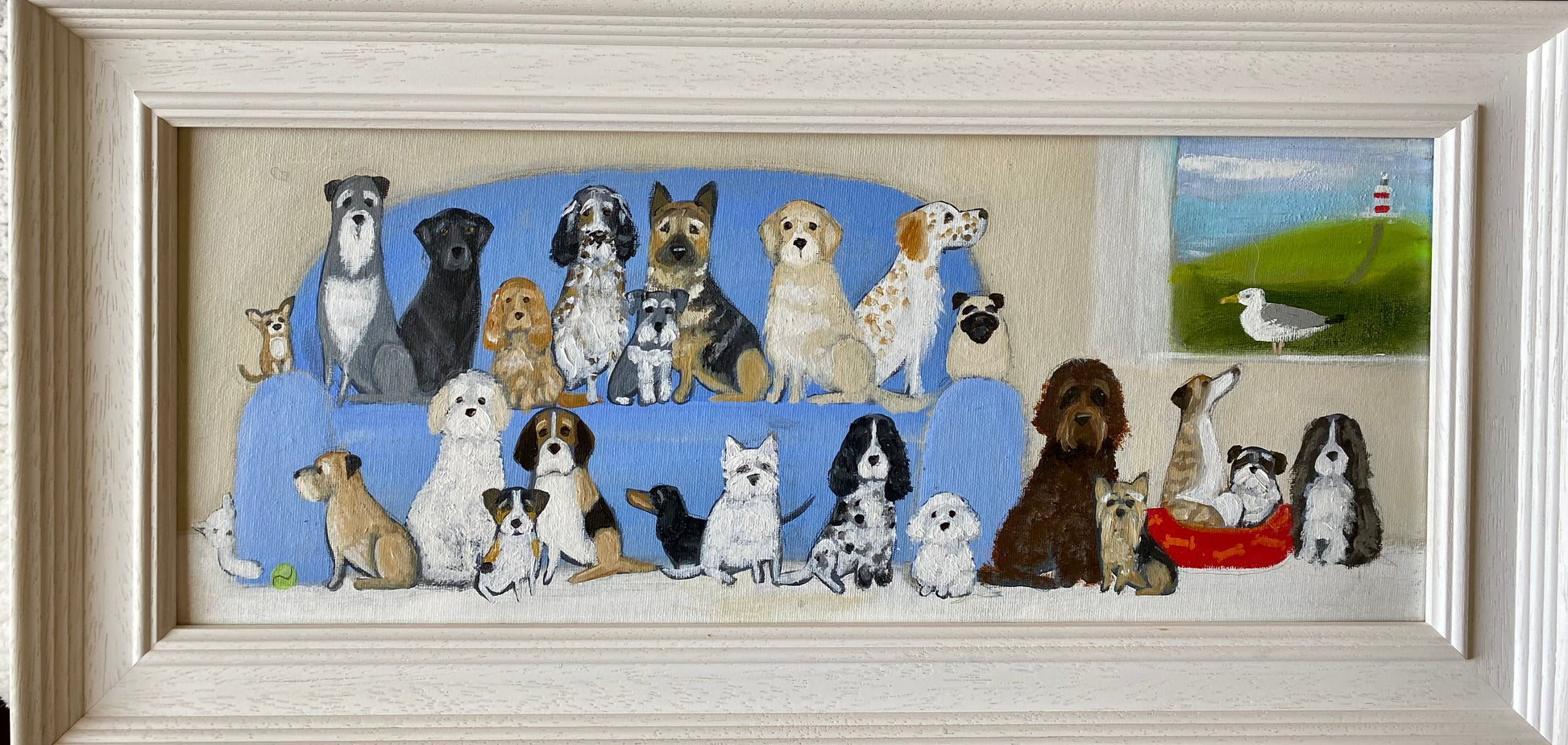 20” x 8” ( 20cm x 50cm) acrylic on canvas board in a bespoke wooden frame.