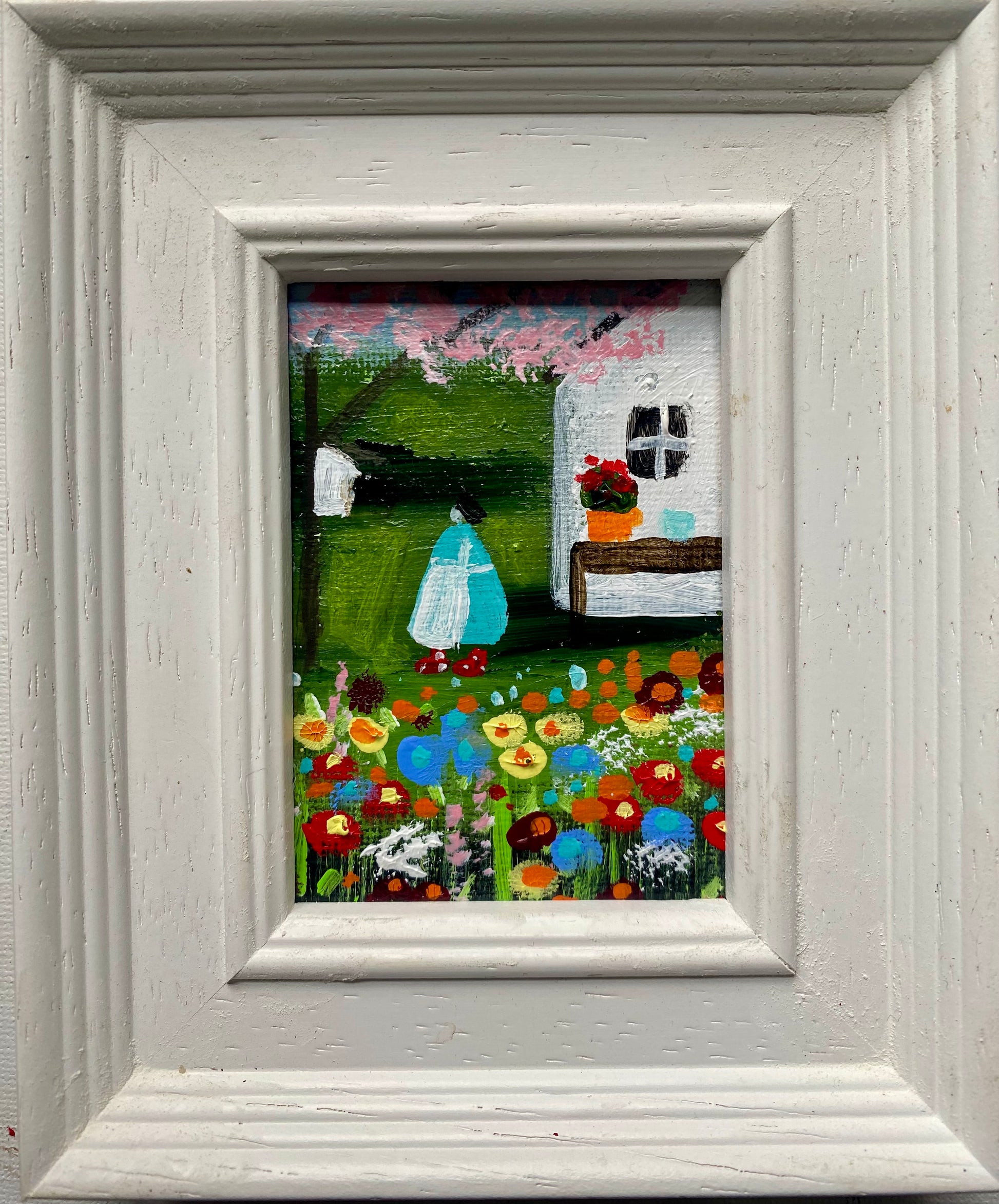 2.5” x 3.5” mini canvas board original in a bespoke wooden frame.