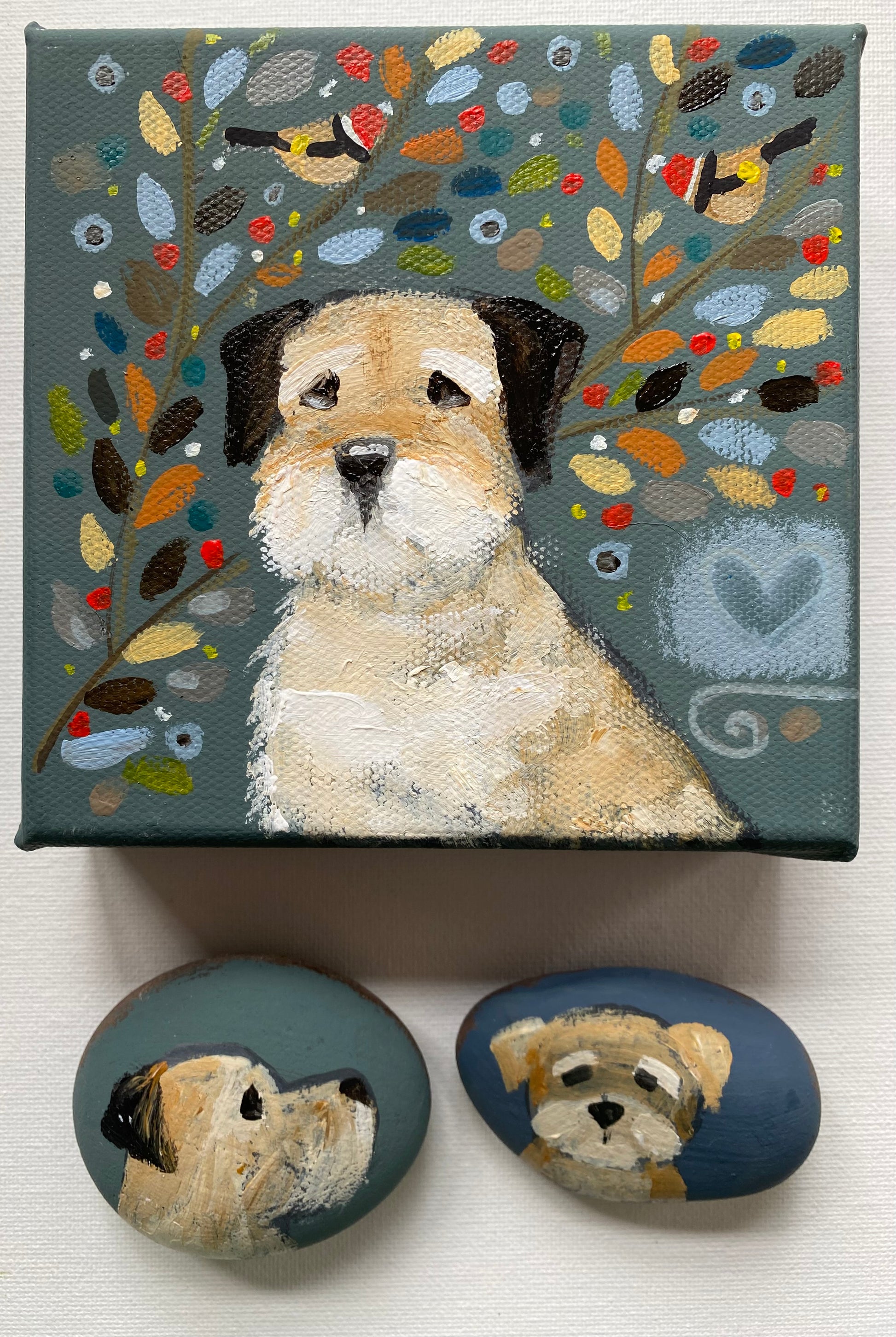 A 6” x 6” chunky box canvas original plus two handpainted stones