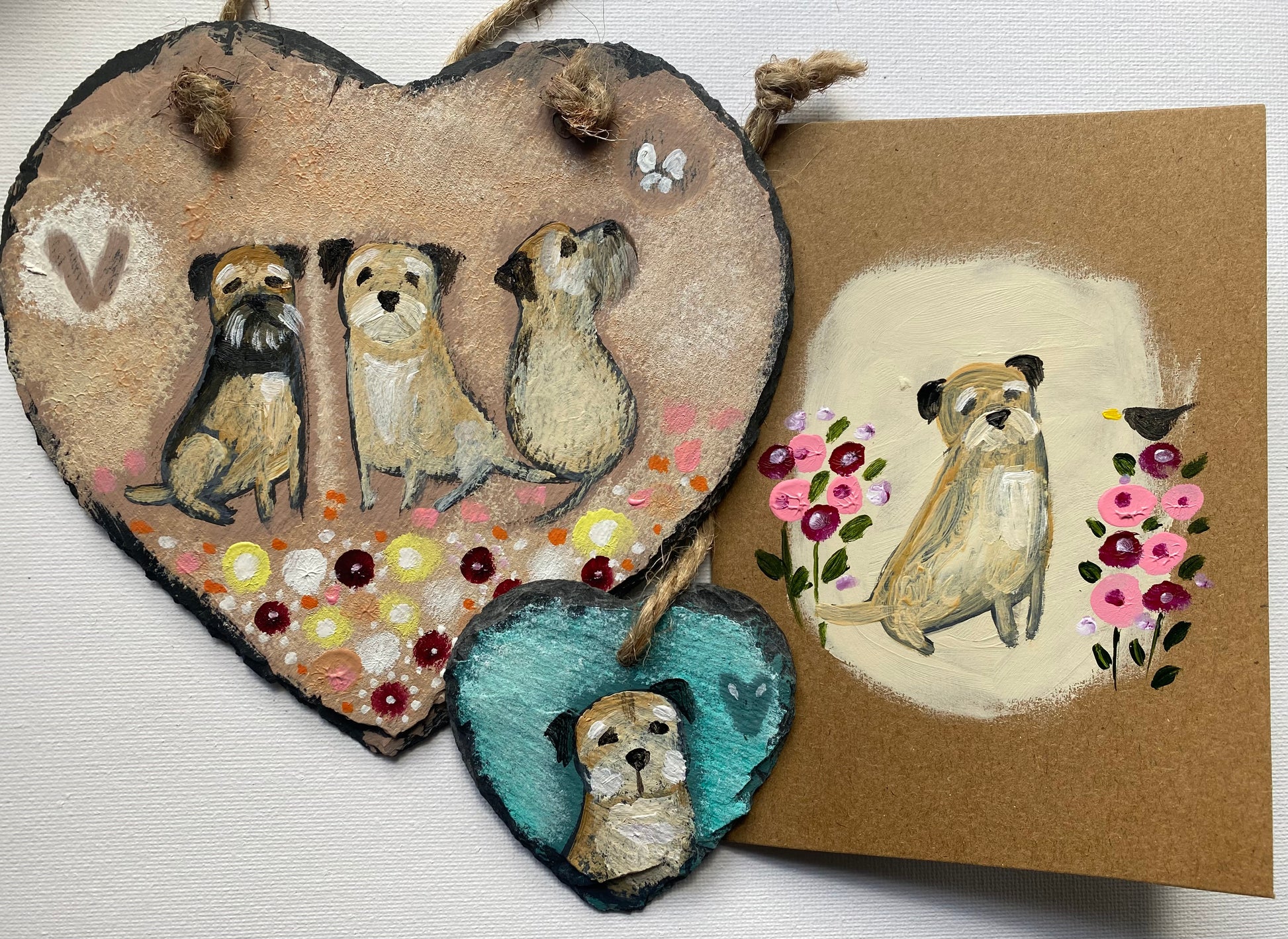 This bundle consists of two slate hangers. One 15cm wide and one 6cm wide plus a handpainted card ( with envelope)
