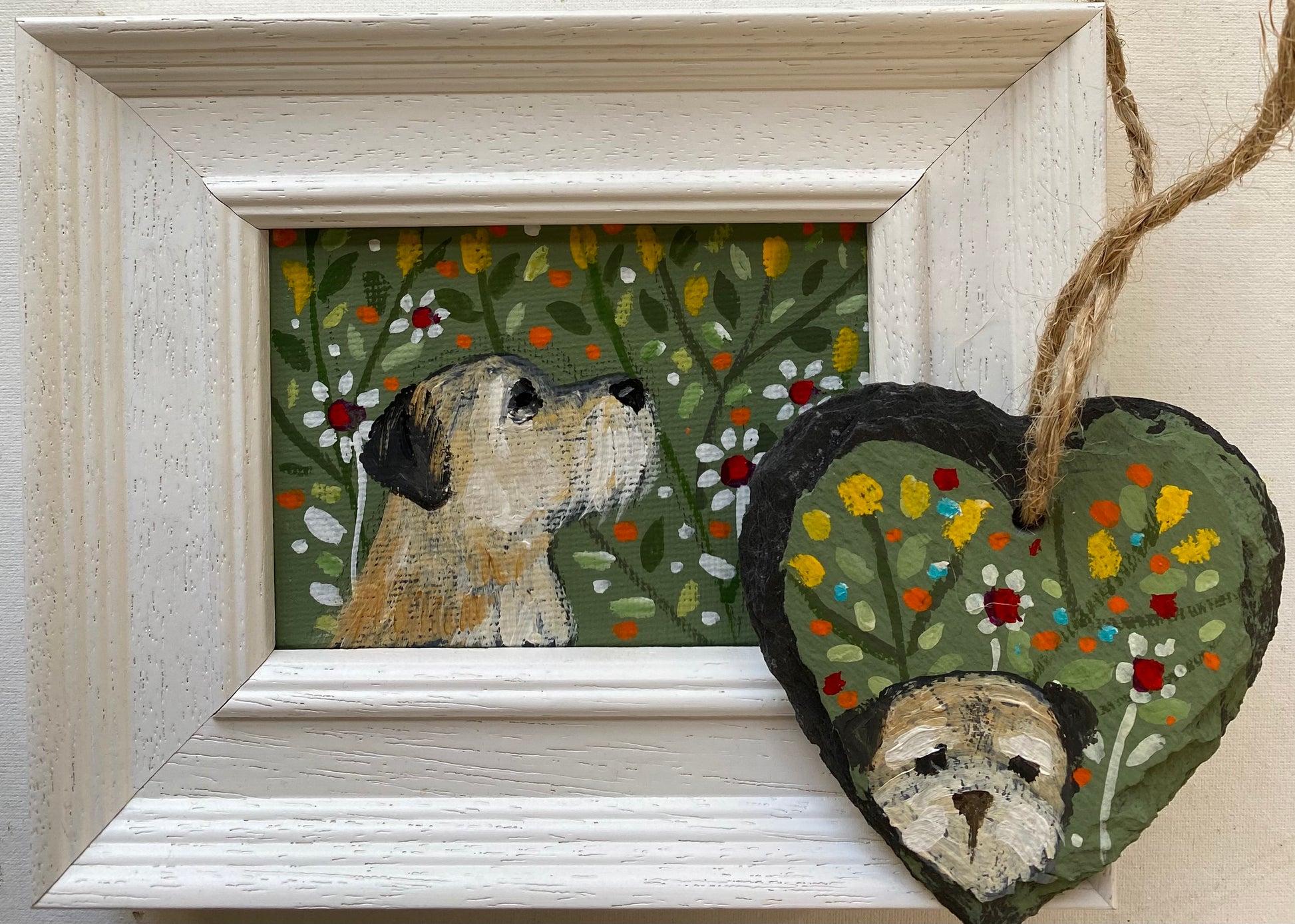 A 2.5” x 3.5” mini canvas board in a bespoke wooden frame plus a 6cm wide mini slate hanger