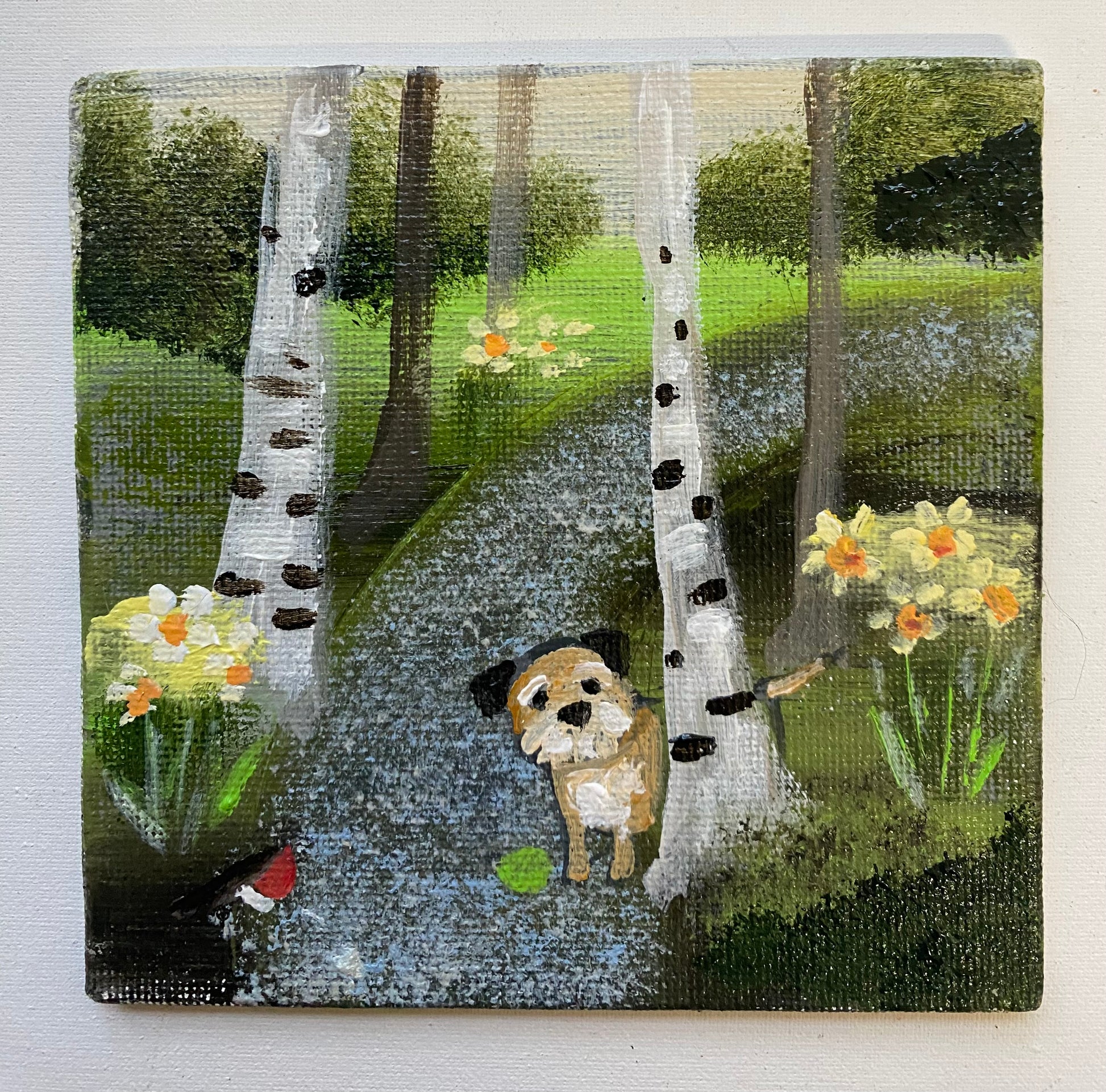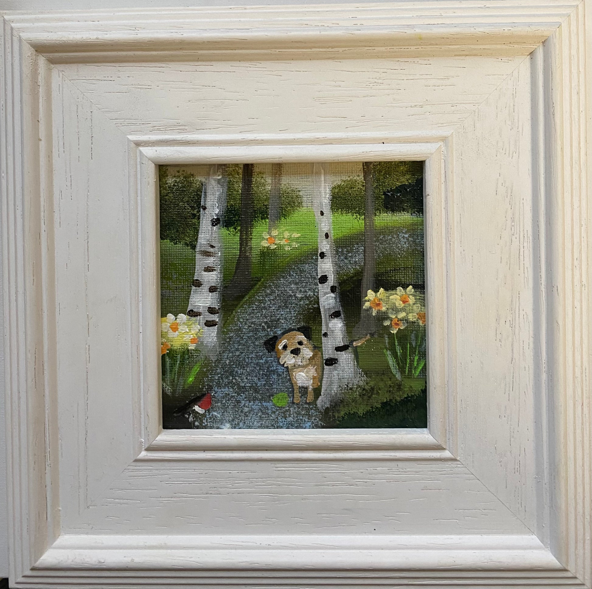 10cm x 10cm acrylic on canvas board in a bespoke, wooden frame.
