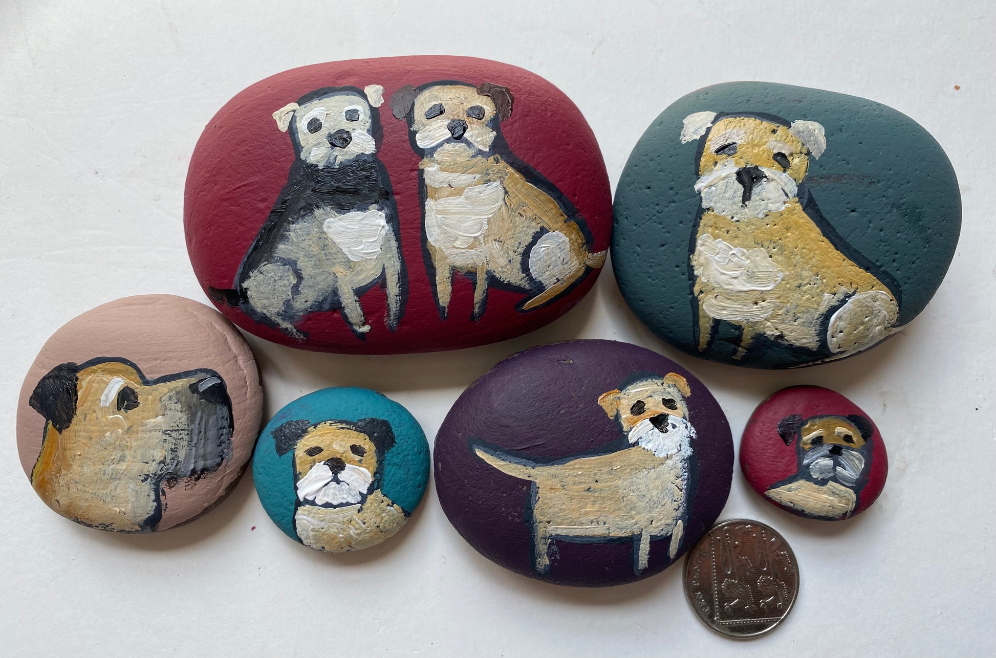 A collection of handpainted stones with a 10p coin for size comparison
