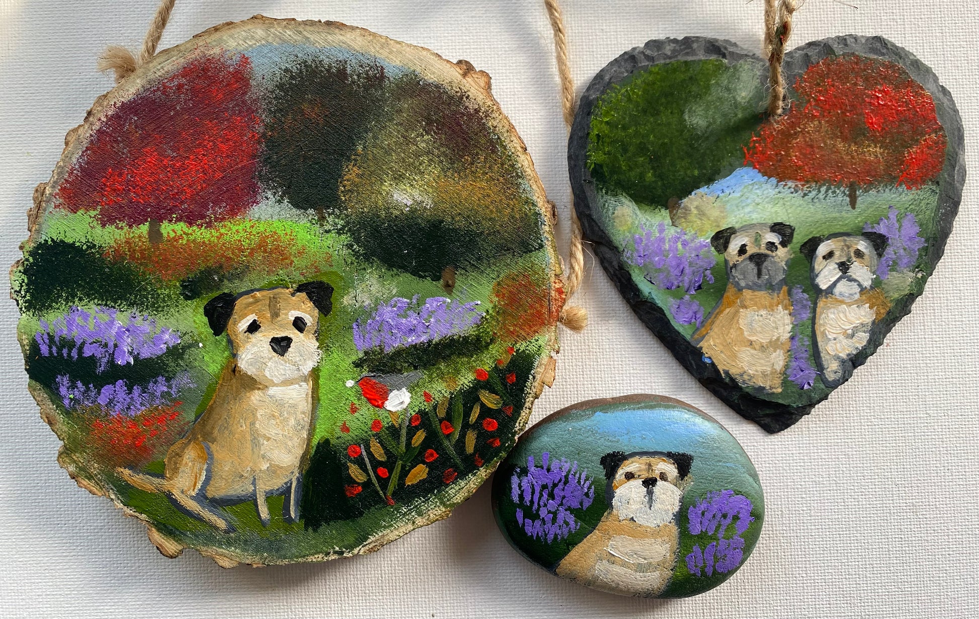 A trio of Border goodies consisting Of a 5” wide wooden ‘slice ‘ hanger, a 4” wide slate hanger and a handpainted pebble.