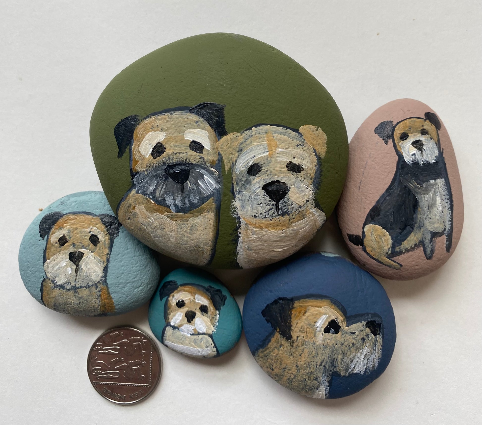 A collection of handpainted pebbles with a 10 pence for size comparison