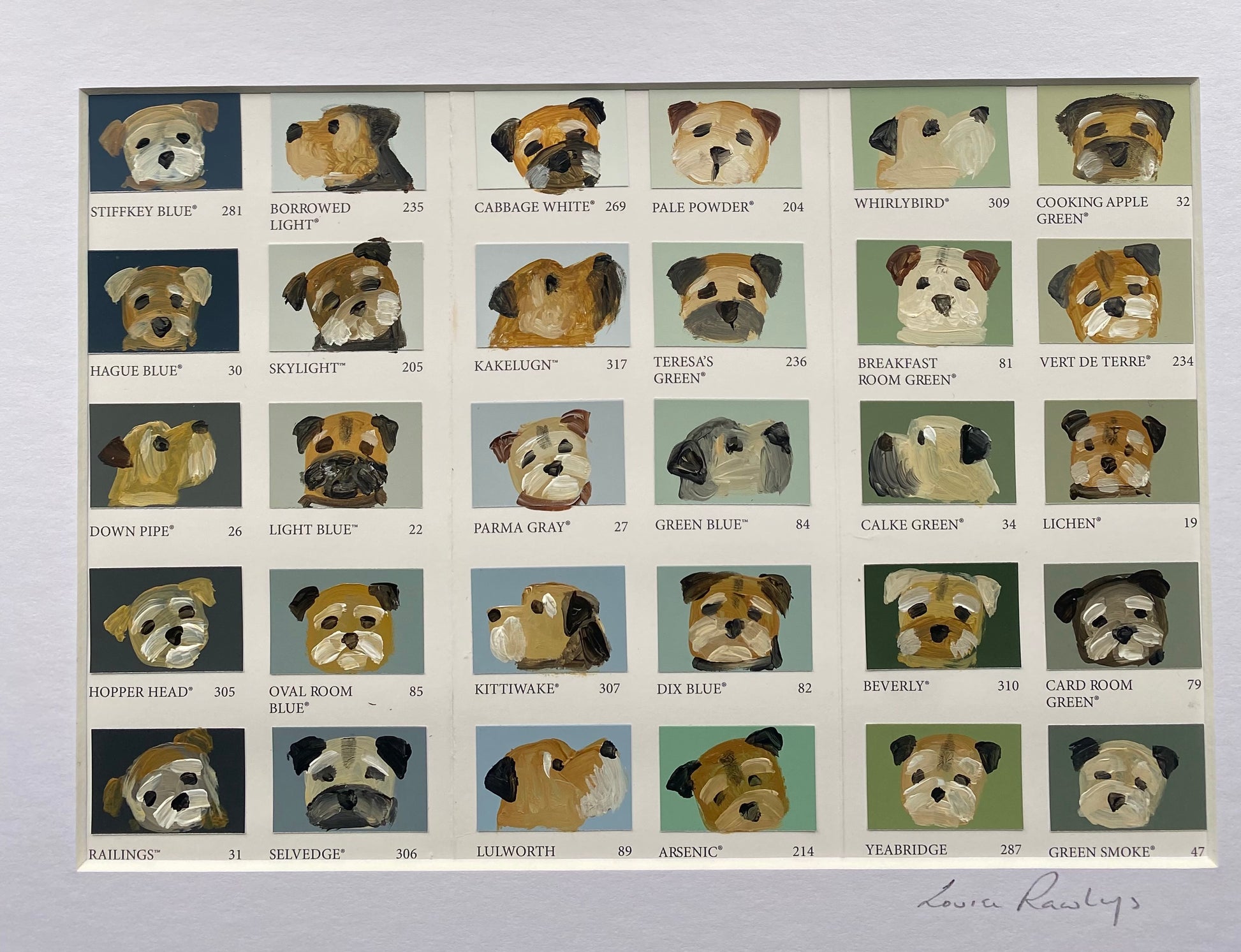 A collection of border faces painted onto a section of a Farrow & Ball colour chart.