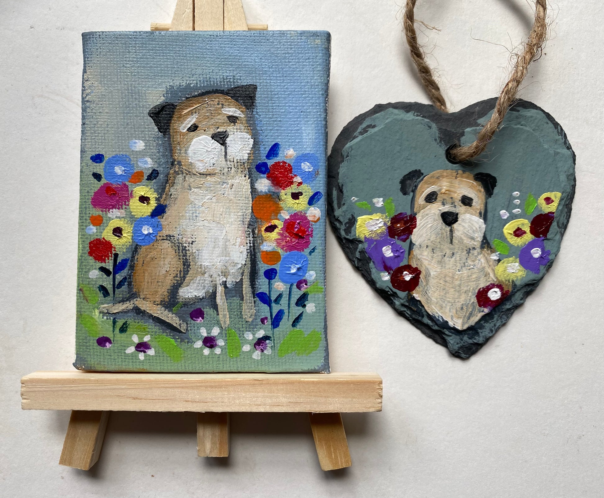 A 2.5” x 3.5” mini canvas board on a small wooden easel plus a 7cm wide slate hanger.