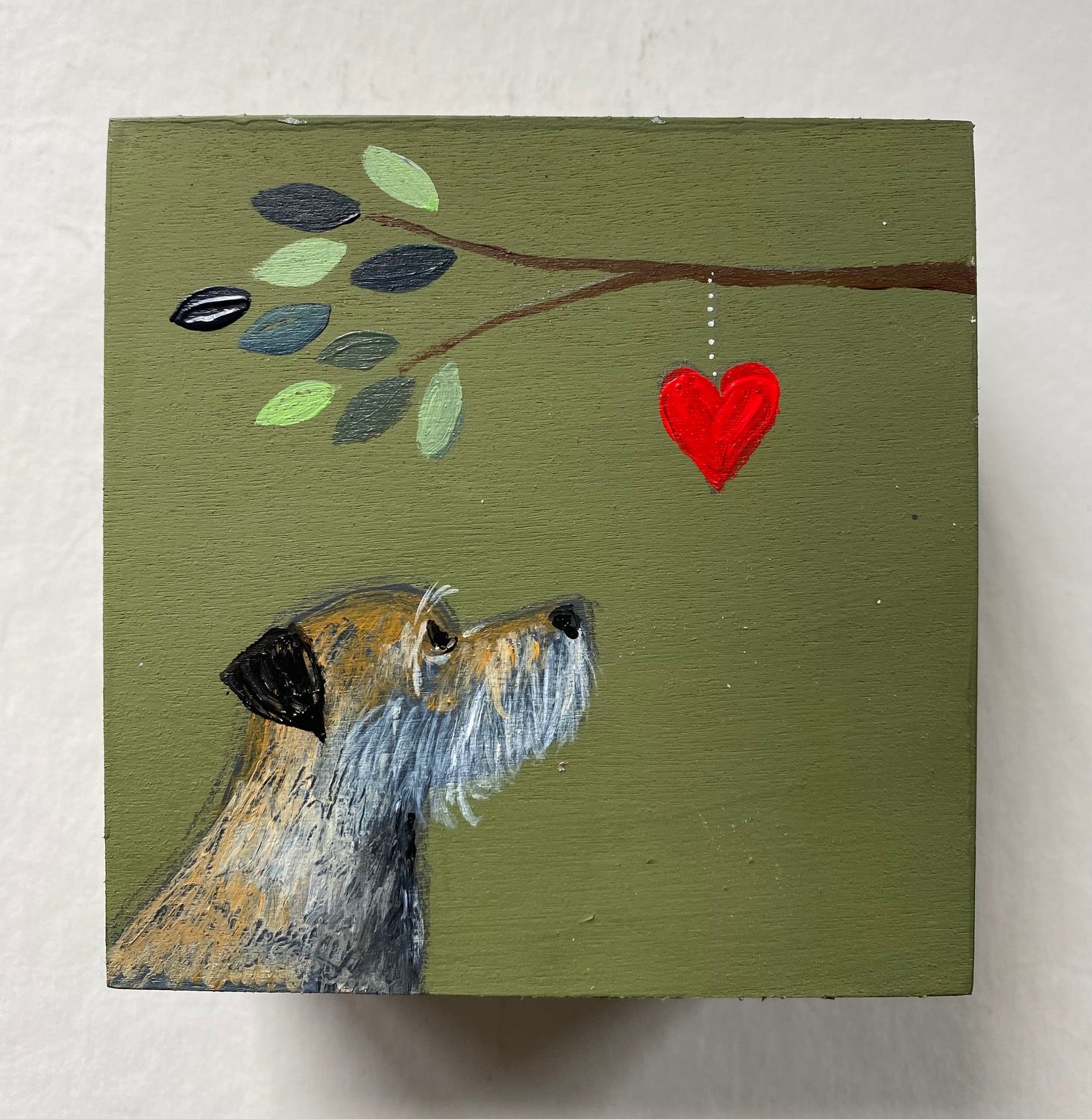10cm x 10cm chunky wooden block. Background shad is Farrow & Ball. The colour follows on to the short sides. Painting will freestand or hang.