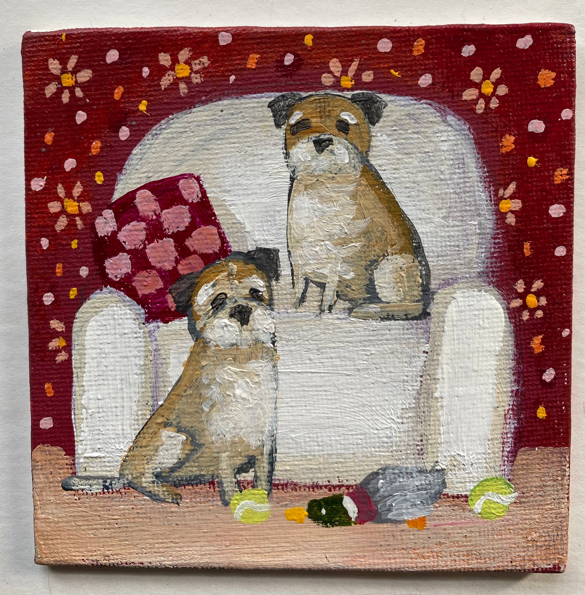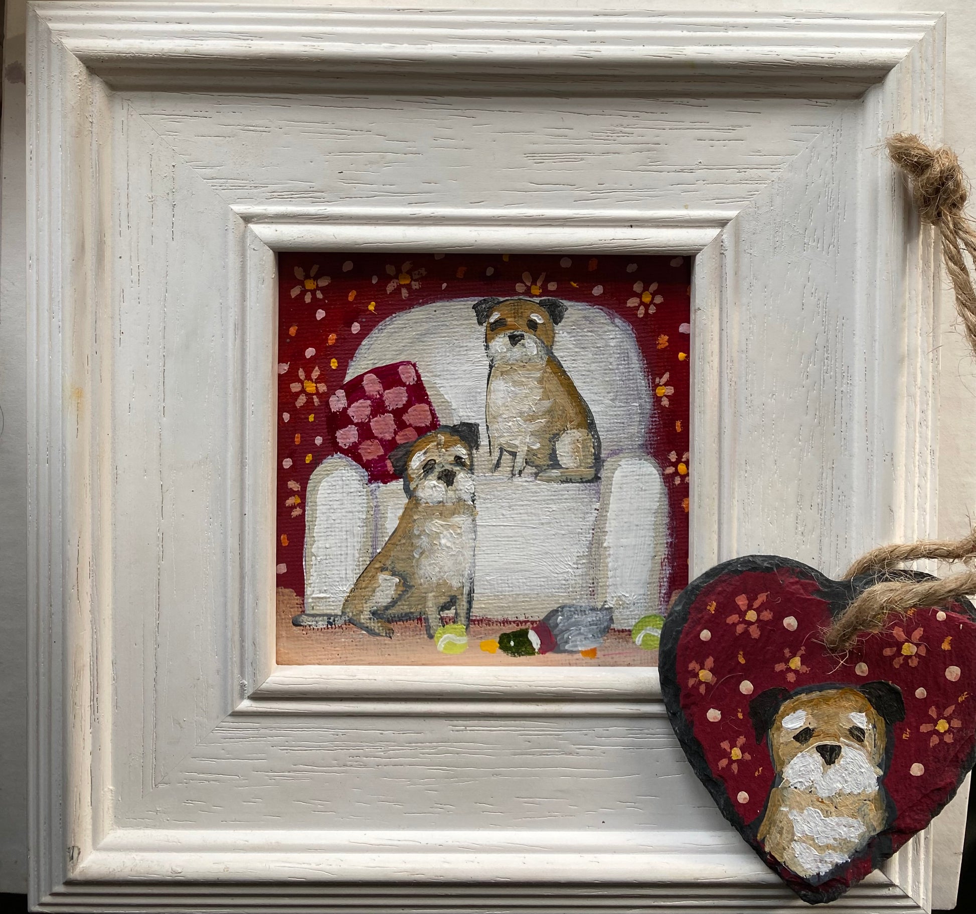 10cm x 10cm acrylic on canvas board in a bespoke wooden frame plus a 6cm wide handpainted mini slate hanger