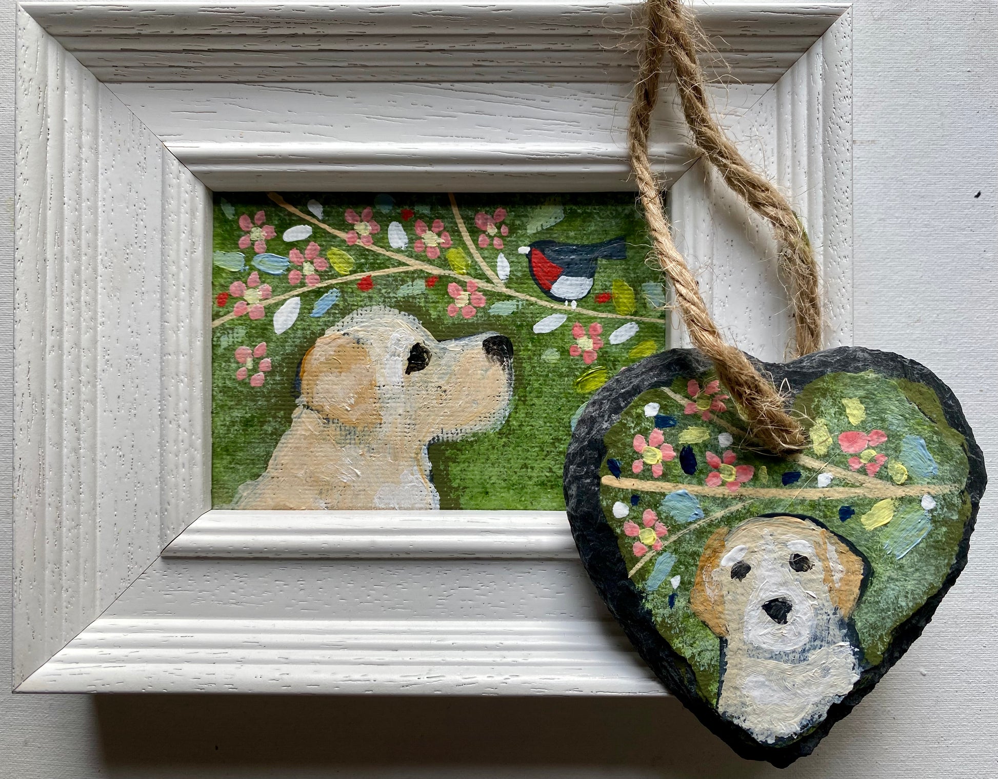 A 2.5” x 3.5” mini canvas board original in a bespoke wooden frame with a 6cm wide mini slate hanger