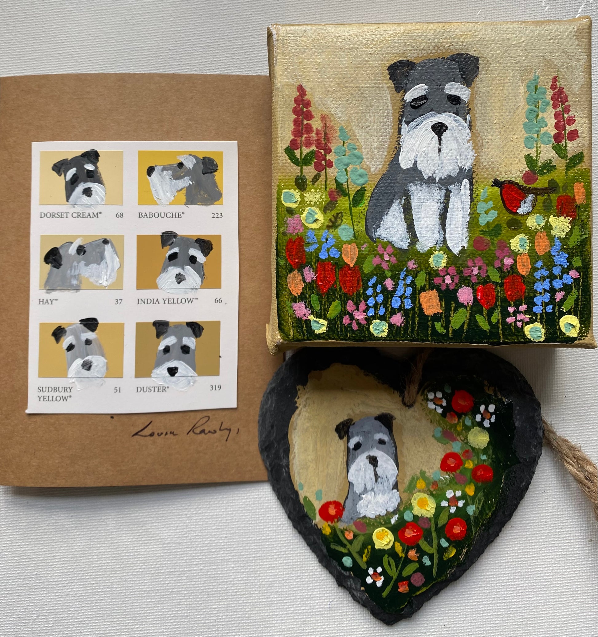 A Schnauzer bundle consisting of a 10cm x 10cm chunky box canvas, 9cm wide slate hanger and a handpainted card with envelope