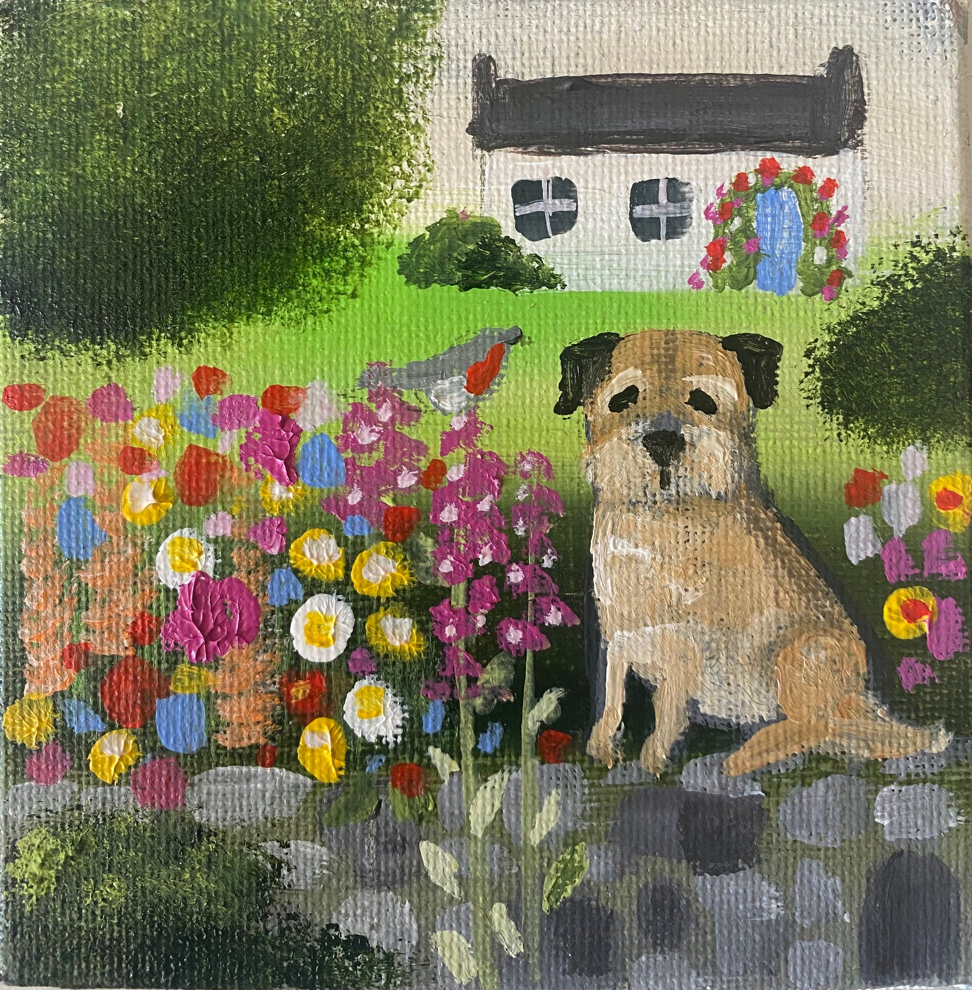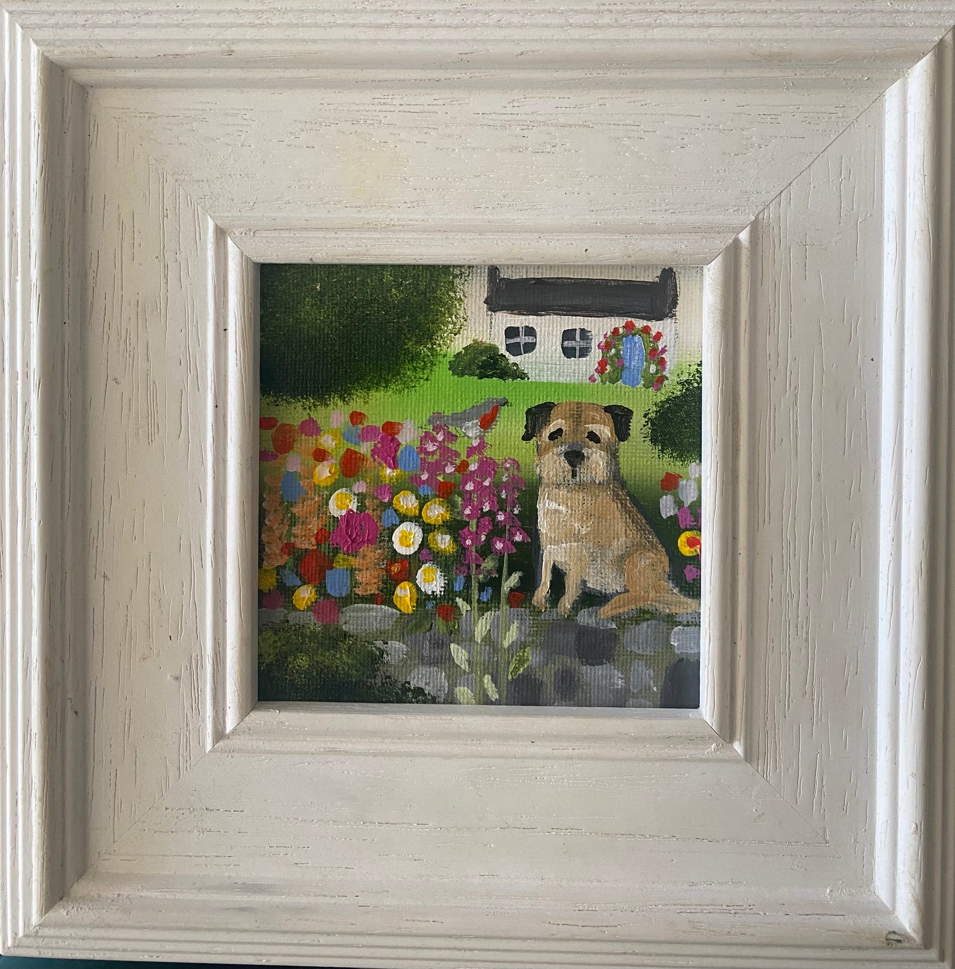 10cm x 10cm acrylic on canvas board in a bespoke wooden frame.