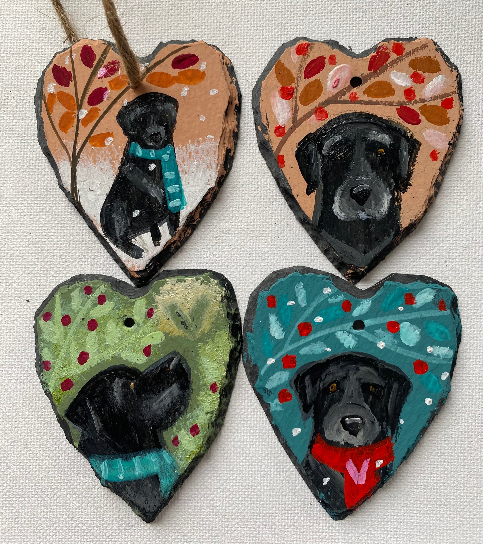 A set of four 6cm wide handpainted slate hangers. All come with string and are signed on reverse and varnished