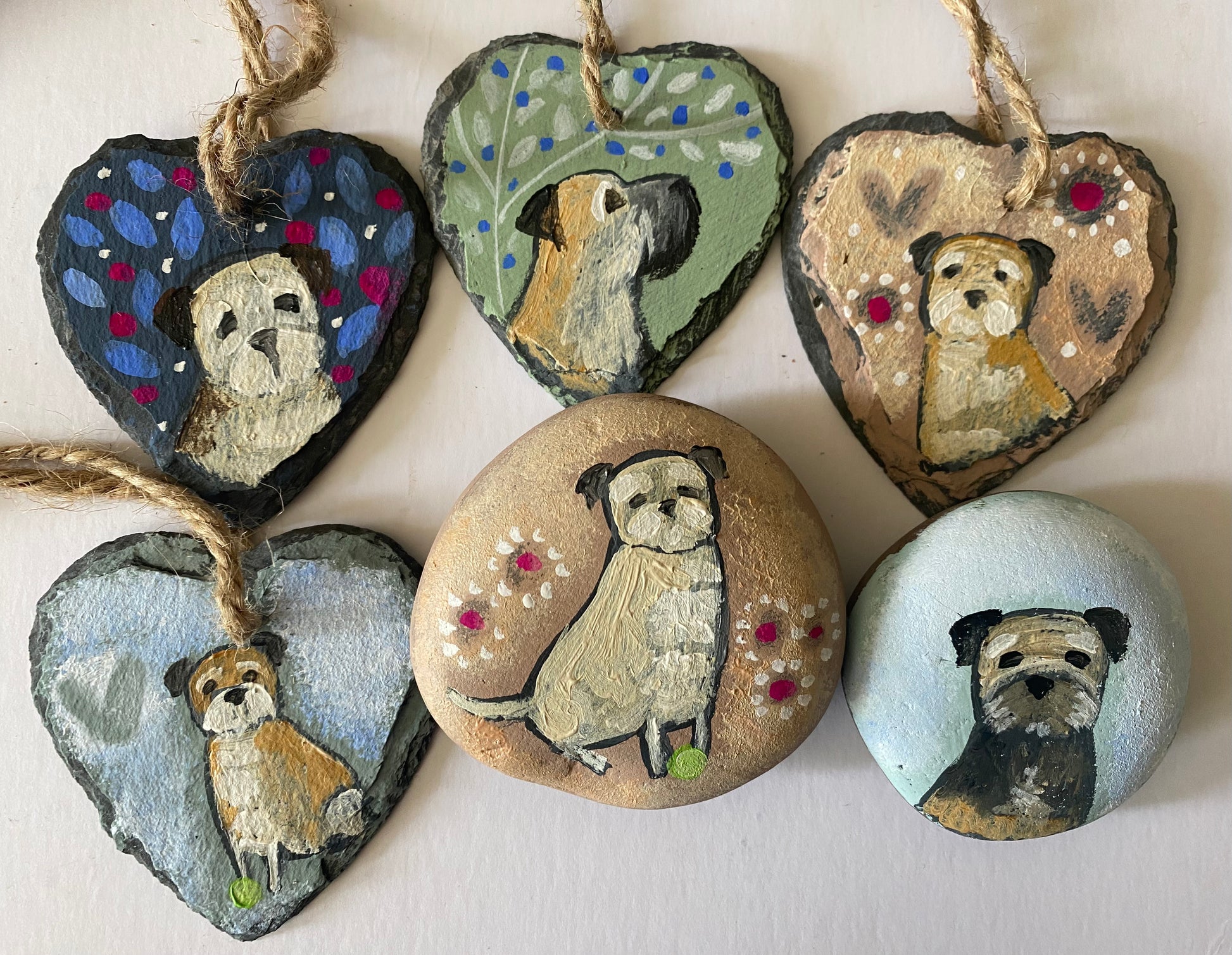 A pick and mix collection consisting of four 6cm slate hangers and three painted stones