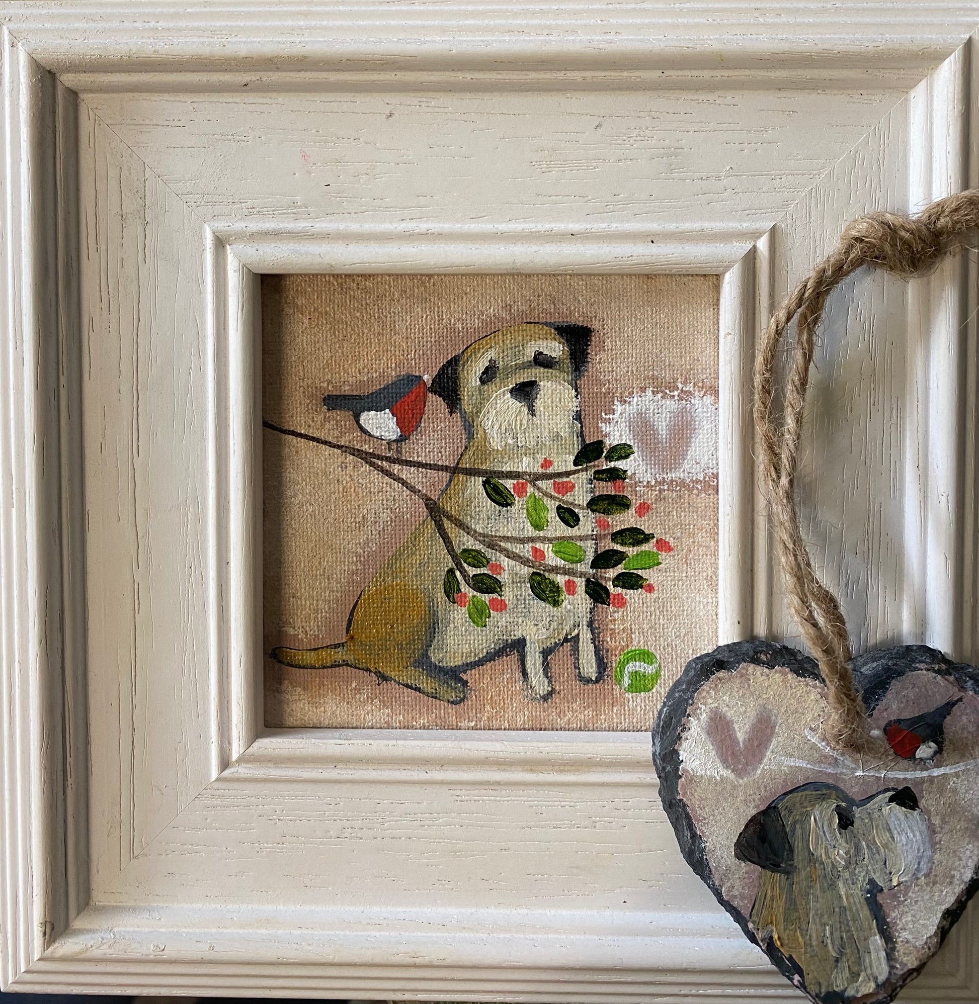 A 10cm x 10cm canvas board in a bespoke wooden frame and a mini slate hanger.
