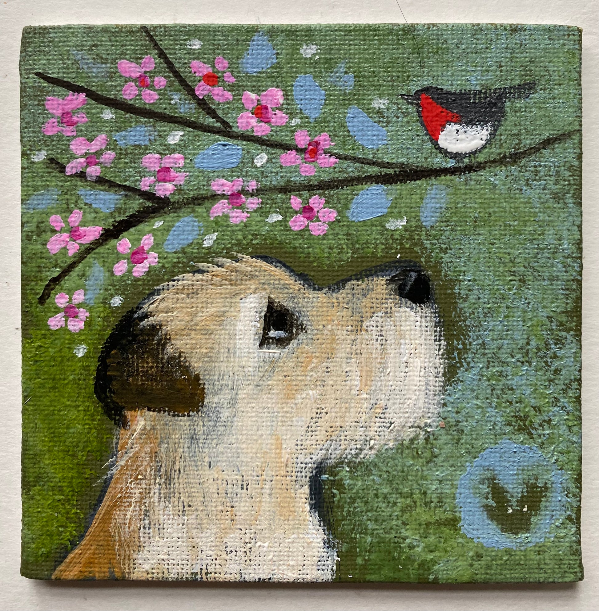 10cm x 10cm acrylic on board in a bespoke wooden frame plus a 6cm wide mini slate hanger